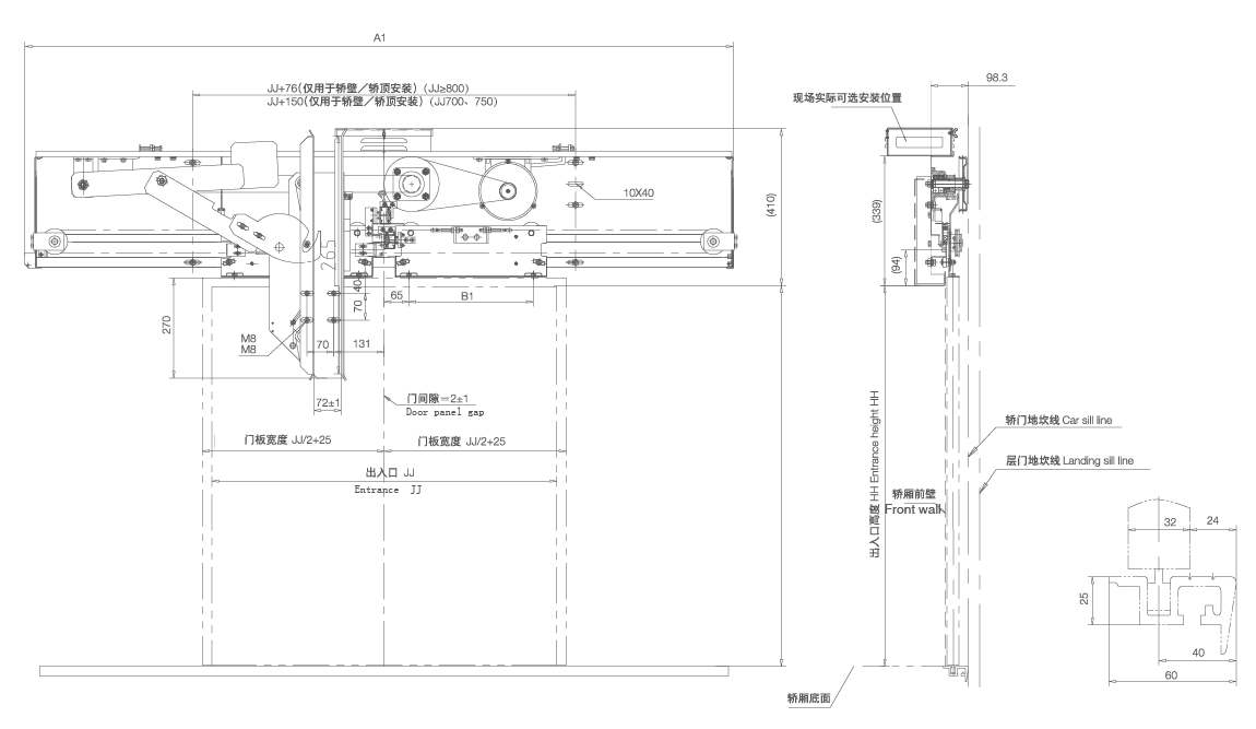 4、采用異步門刀,選配轎門鎖;轎架、轎頂安裝方式